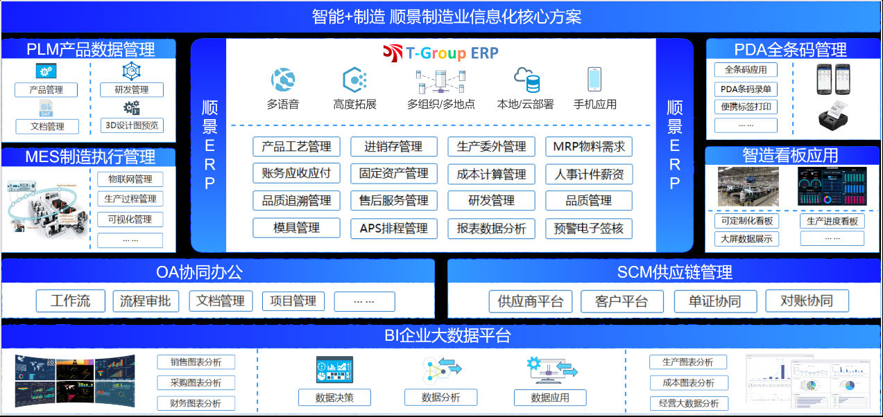 顺景ERP系统,以制造为核心,将制造企业最核心的生产管理需求与供应链管理、财务管理相结合完美结合,打造以生产计划为核心的全程一体化管理体系,打破各部门、各环节、各系统之间沟通和协作的壁垒,建立规范、灵捷、高效的业务流程,实现销售、PMC、采购、仓库、品质、人资、财务、工程技术部门等所有环节全程无缝管理,确保了数据信息在传递过程中的准确性、时效性和有效性,帮助企业快速反应、紧密协作、良好运营,更快推进业务发展,全面提升核心竞争力。